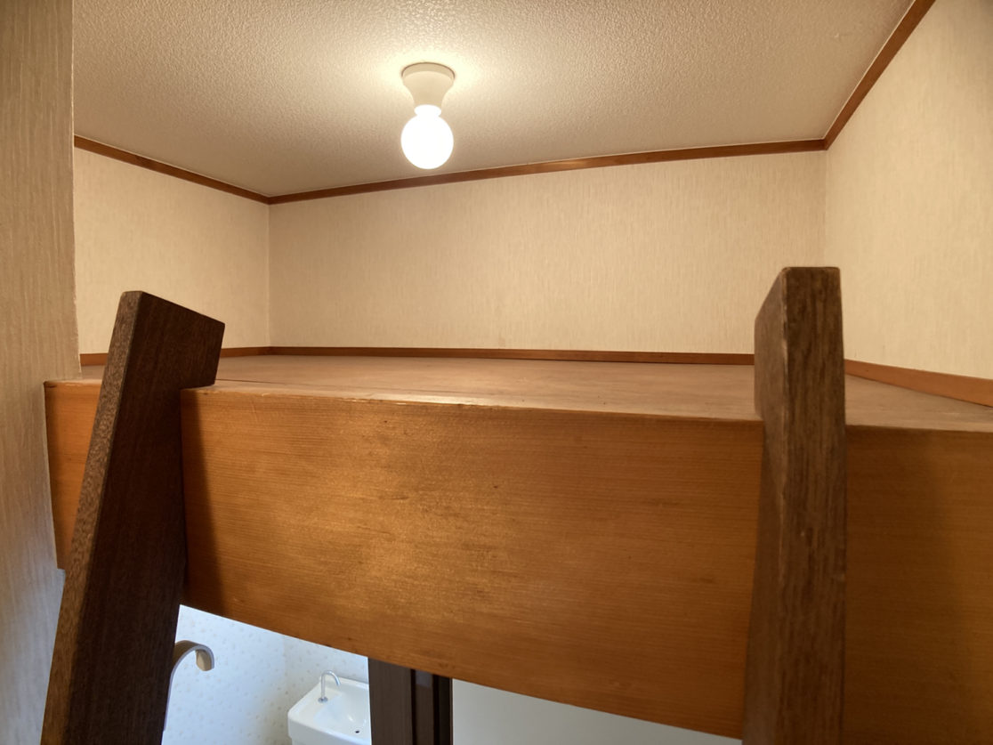 また、玄関横にはしごがありまして、高さはあまりありませんがロフト収納が付いているのもポイントです。普段使わないちょっとしたものなどしまっておくのに便利だと思います。